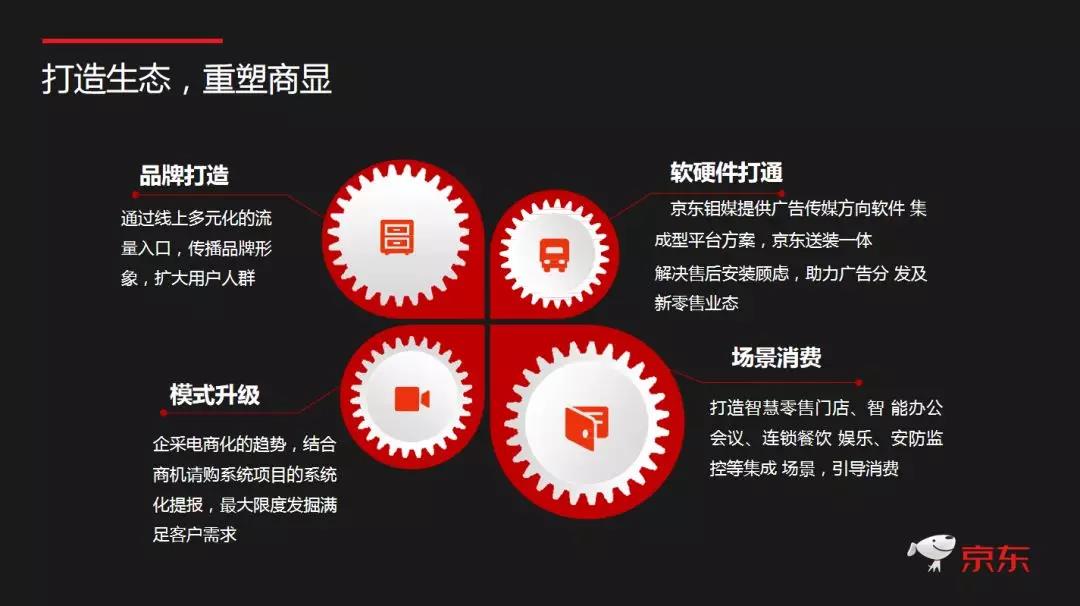 二是软硬件打通。京东也在做钼媒,提供京东钼媒广告传媒方向的软件继承型平台方案,做成京东送装一体,解决售后安装顾虑,助力广告分发及新零售业态。这个是可以和各位合作的,形成产业链。一部分做生产制造,一部分做研发,还有一部分做售后,我们也可以做成大型的,你可以承接深圳,也可以承接广西,各个地方都可以做。